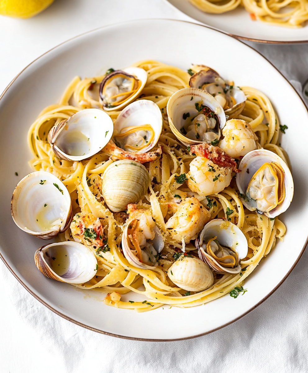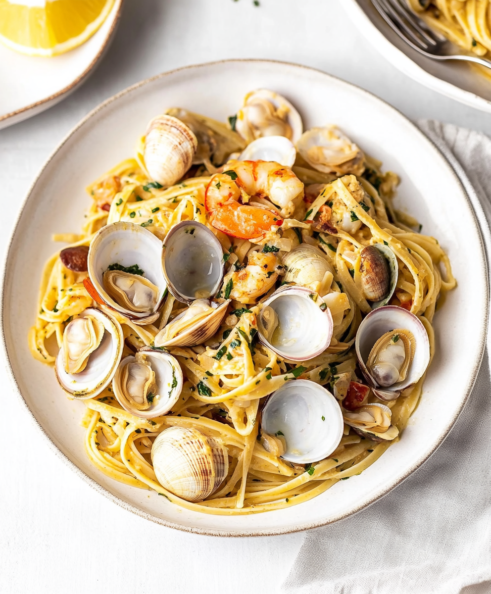 Linguine is the pasta of choice here. Its flat shape holds just enough of the white wine sauce without overpowering the delicate seafood. If you prefer, you can substitute spaghetti or fettuccine, but linguine strikes the perfect balance.